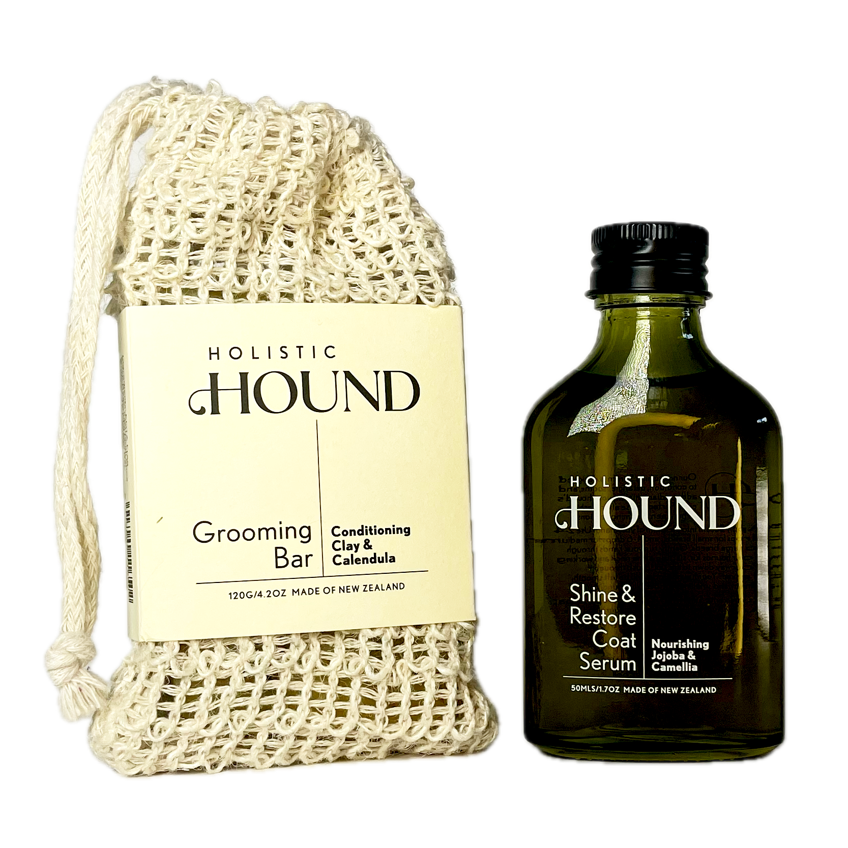 Keep your hound feeling fresh and looking their best with this simple two-step grooming duo. The Grooming Bar lifts dirt and odour while soothing sensitive skin, and the Coat Serum follows to condition, detangle and add a natural, healthy shine.