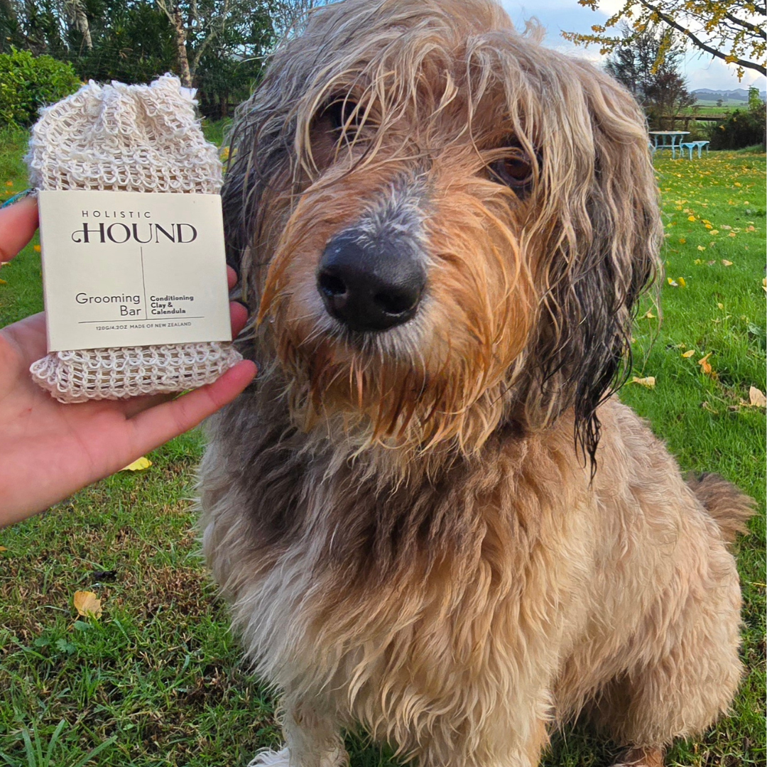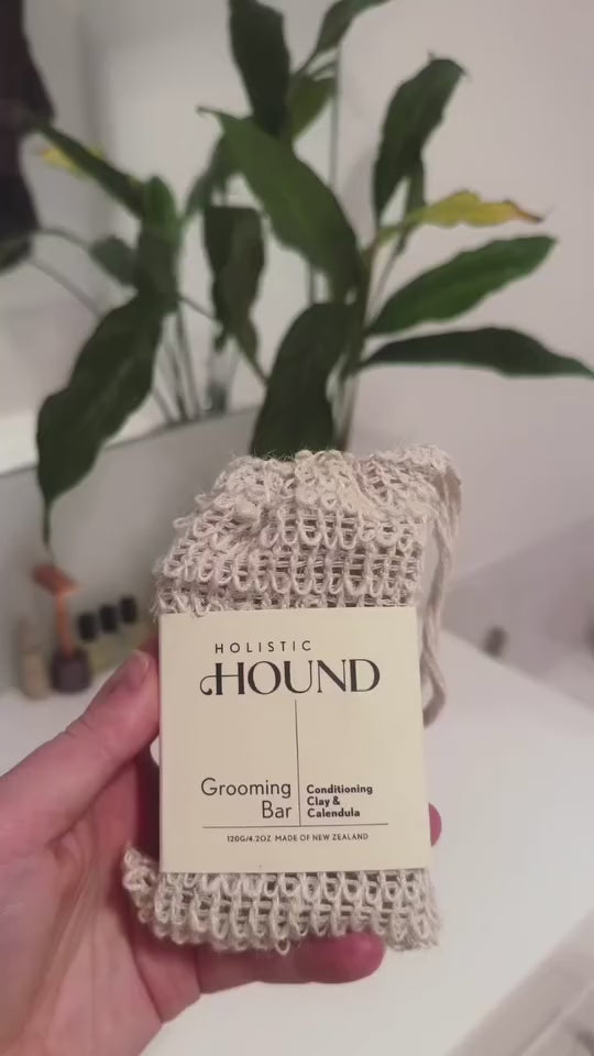 Housed in a compostable sisal bag, it lathers beautifully while gently exfoliating, helping to stimulate natural skin oils for a healthy, shiny coat, because every hound deserves to feel their best!
