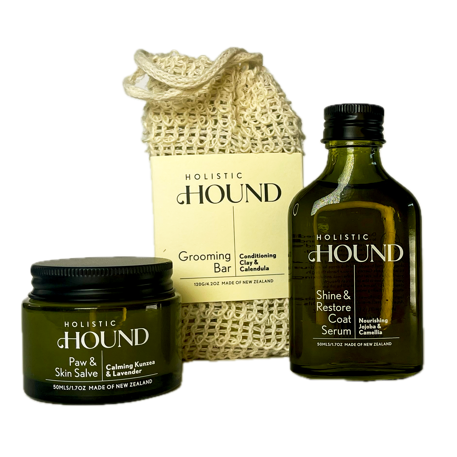 The Grooming Bar gently cleanses and soothes, supporting healthy skin while leaving the coat soft and fresh. The Coat Serum restores shine and manageability, smoothing the coat with natural nourishment. The Paw & Skin Salve locks in moisture and protects against dryness, irritation, and the elements.